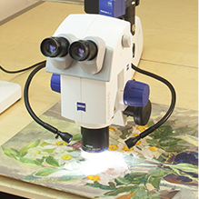 Микроскоп даёт наиболее полную информацию о живописной поверхности. При 375-кратном увеличении становится возможным детальное исследование холста, грунта, красочного слоя и способа нанесения подписи. Например, исследование с помощью микроскопа позволяет определить границы авторского красочного слоя и реставрационных записей.
